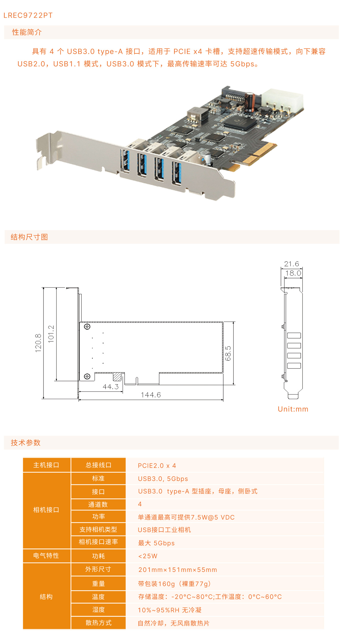 具有 4 個(gè) USB3.0 type-A 接口,適用于 PCIE x4 卡槽,支持超速傳輸模式,向下兼容 USB2.0,USB1.1 模式,USB3.0 模式下,最高傳輸速率可達(dá) 5Gbps。