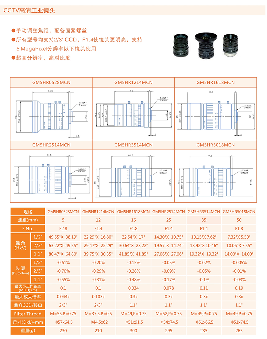 CCTV高清工業(yè)鏡頭手動調(diào)整焦距,配備固緊螺絲,所有型號均支持2/3"CCD,F(xiàn)1.4使鏡頭更明亮,支持5MegaPixel分辨率以下鏡頭使用,超高分辨率,高對比度。